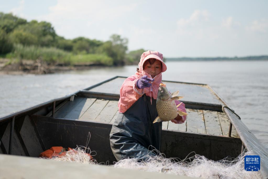 在黑龍江省同江市八岔赫哲族鄉八岔村二道江灘地,赫哲族村民叢秀松把剛打上來的魚扔進船艙(2020年7月22日攝)。