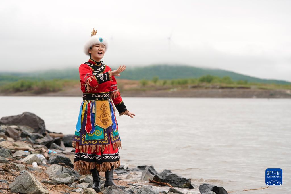 在黑龍江省同江市街津口赫哲族鄉(xiāng)漁業(yè)村,赫哲人劉蕾展示一段赫哲族歌舞(2022年5月21日攝)。