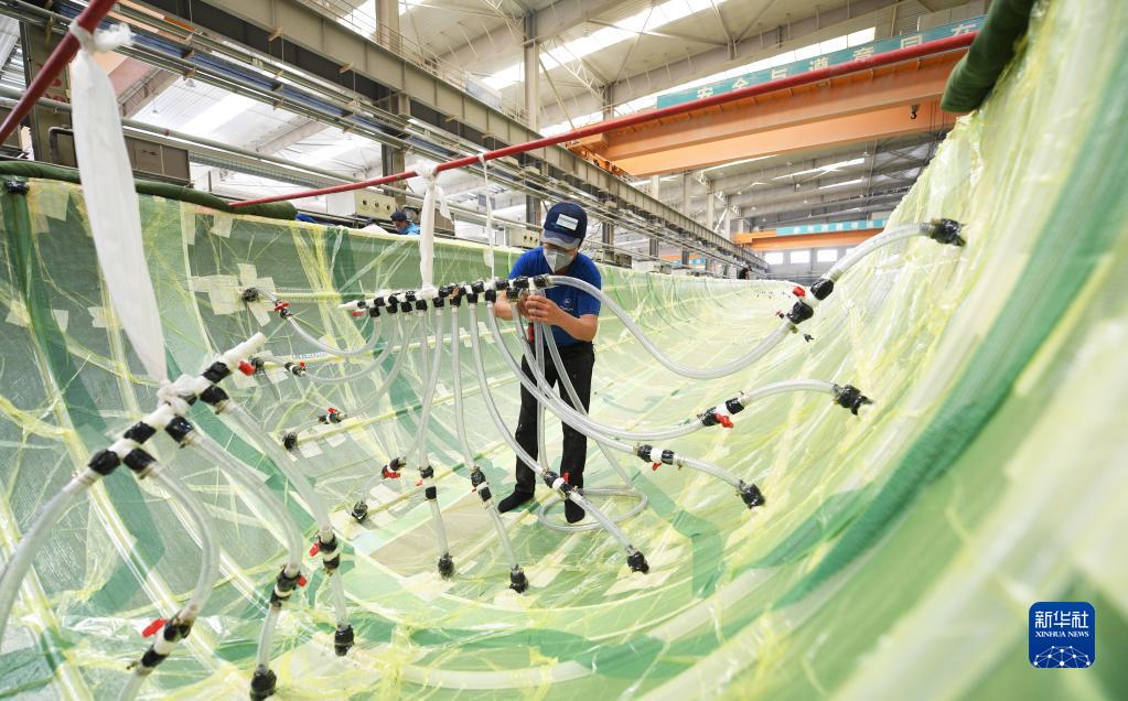 9月28日,在位于信陽高新區(qū)的河南明陽智慧能源有限公司,工作人員為風(fēng)電設(shè)備安裝灌注樹脂用的鋼絲水管。