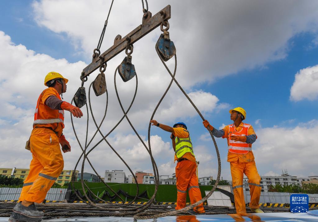 10月3日,中鐵十一局的工人在廣花城際鐵路白云城市中心站施工。