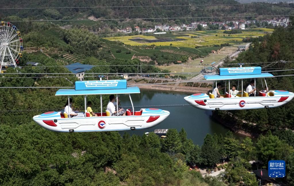 10月3日,游客在浙江省武義縣七旗山景區(qū)體驗“空中飛船”。