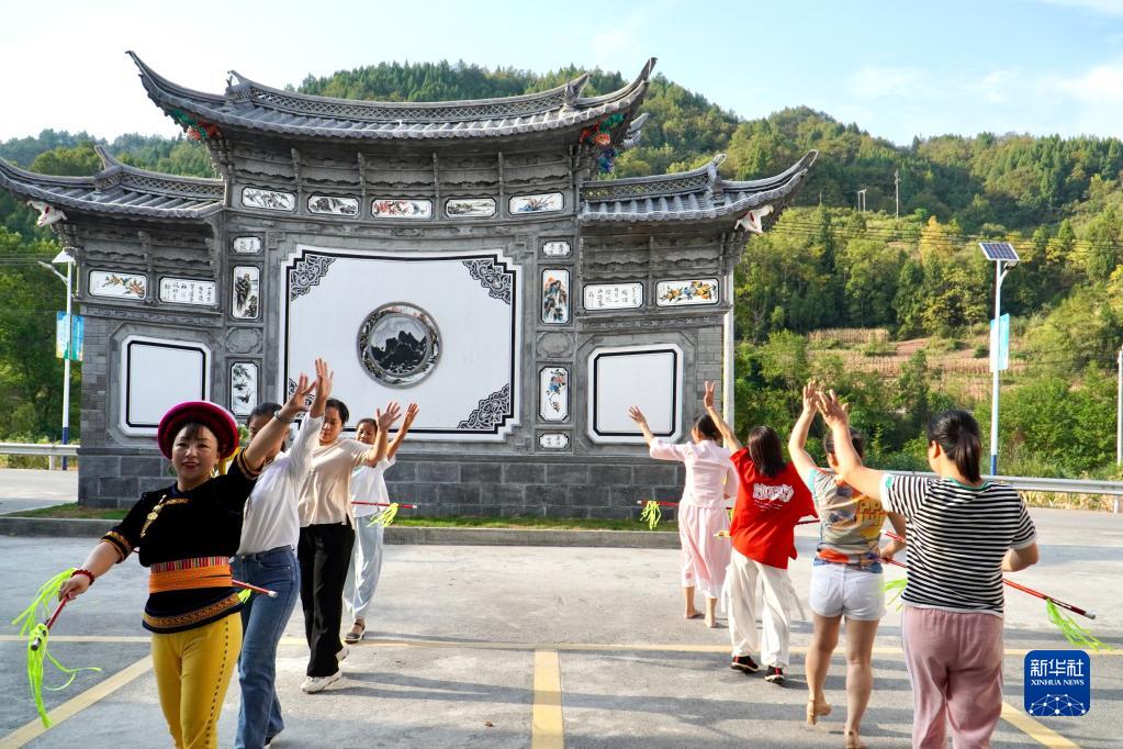 在湖南省桑植縣芙蓉橋白族鄉合群村,張丕和(左一)帶領村民學習白族舞蹈(9月8日攝)。