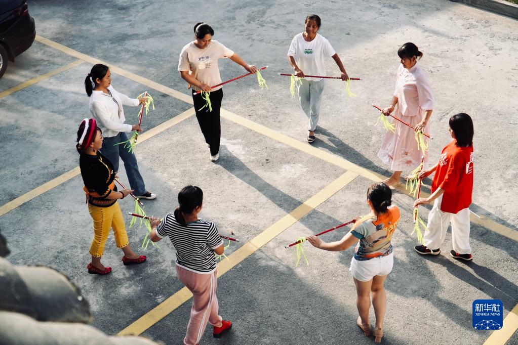 在湖南省桑植縣芙蓉橋白族鄉(xiāng)合群村,張丕和(左一)帶領(lǐng)村民學(xué)習(xí)白族舞蹈(9月8日攝)。