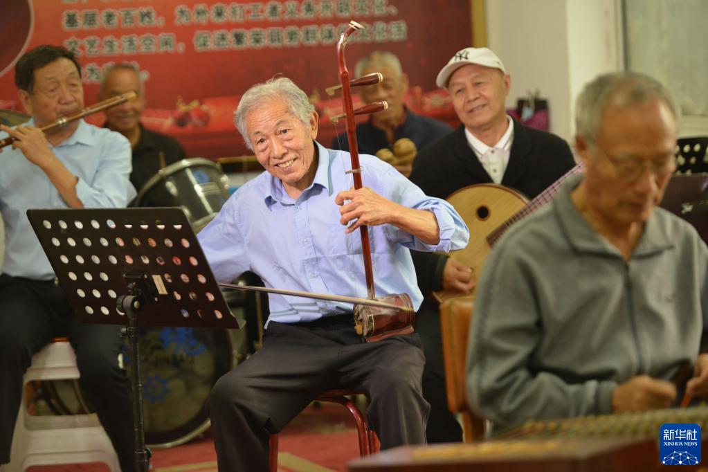 10月2日,80歲的劉名飛(中)在河北省石家莊市欒城區農民工俱樂部排練。劉名飛參加農民工俱樂部已有11年,義務為鄉親們表演。