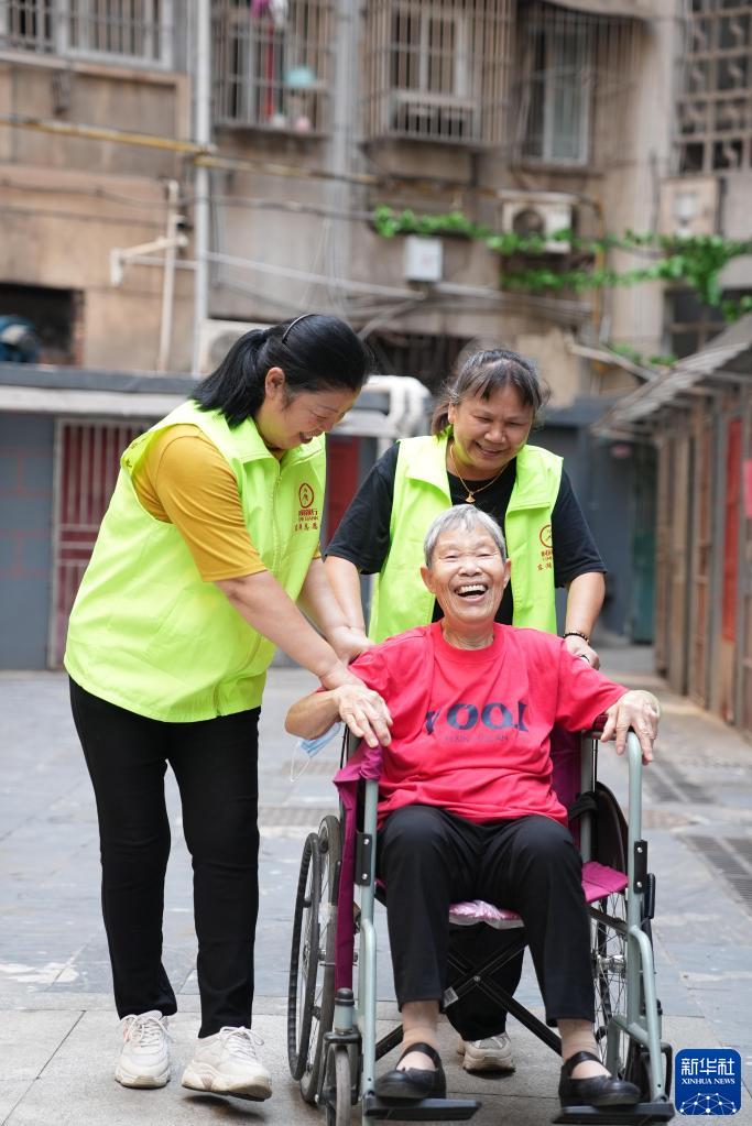 在南昌市東湖區火神廟社區,“時間銀行”志愿者推著老人外出(9月29日攝)。