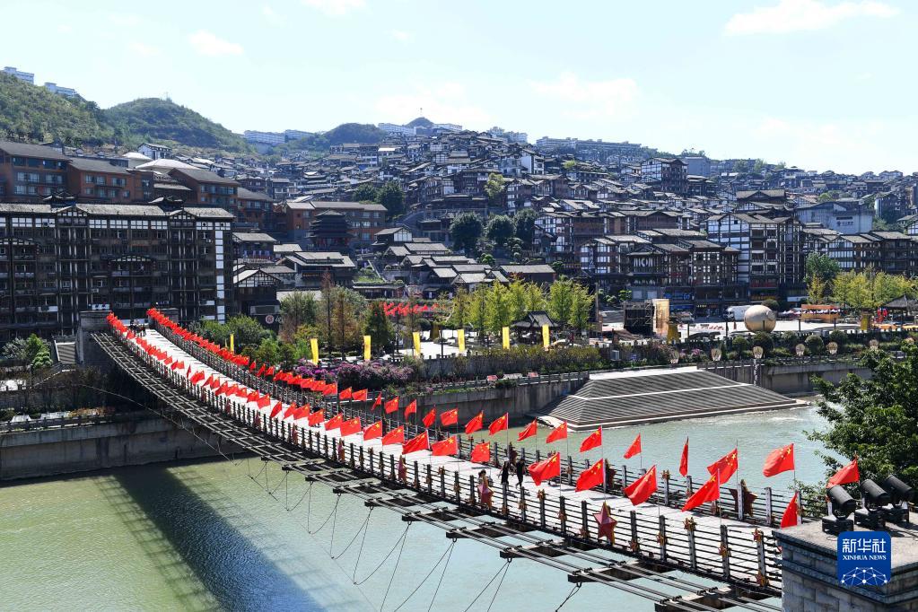 10月3日,在貴州省仁懷市茅臺鎮,茅臺渡口鐵索橋上的五星紅旗迎風飄揚。