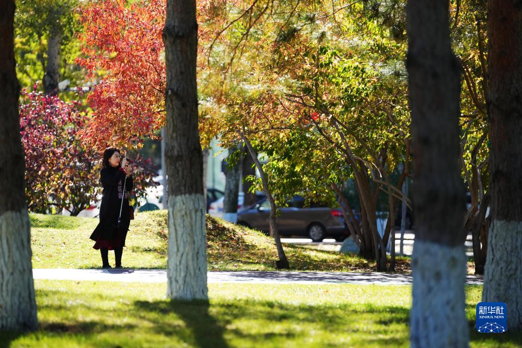 10月4日,市民在黑龍江哈爾濱市湘江公園拍照。