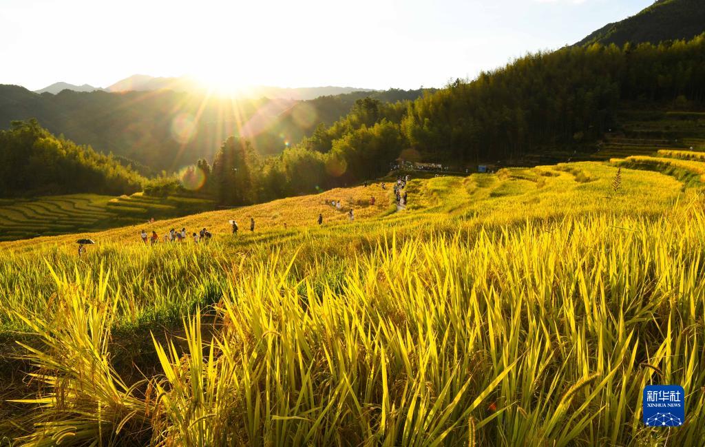這是10月3日拍攝的落日下的廣東省清遠市連山壯族瑤族自治縣太保鎮(zhèn)歐家村歐家梯田美景。該梯田進入最佳觀賞期。