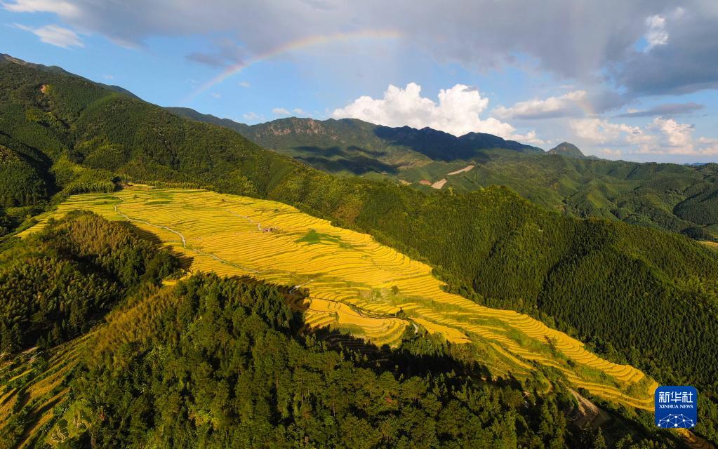 在廣東省清遠市連山壯族瑤族自治縣太保鎮歐家村,彩虹與金黃色的歐家梯田相映成趣(10月3日攝,無人機照片)。