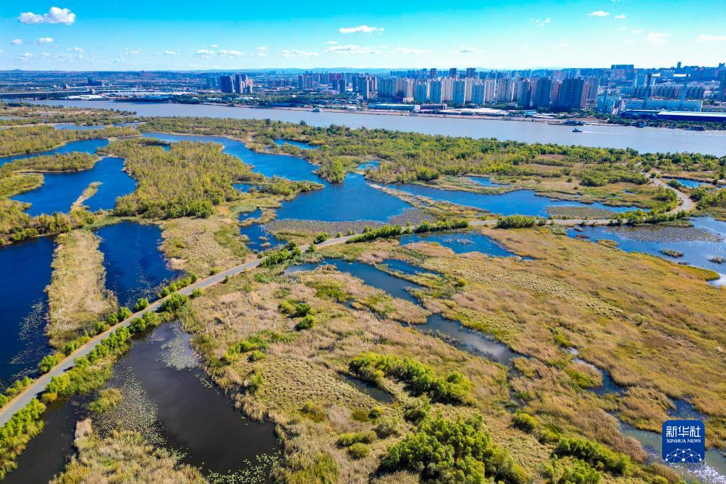 這是10月4日拍攝的哈爾濱市阿勒錦島國家級濕地公園景色(無人機照片)。