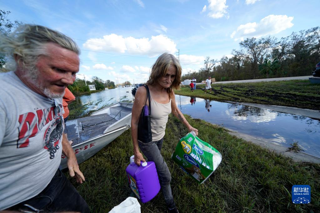 10月3日,在美國(guó)佛羅里達(dá)州阿卡迪亞,當(dāng)?shù)孛癖婎I(lǐng)取物資。