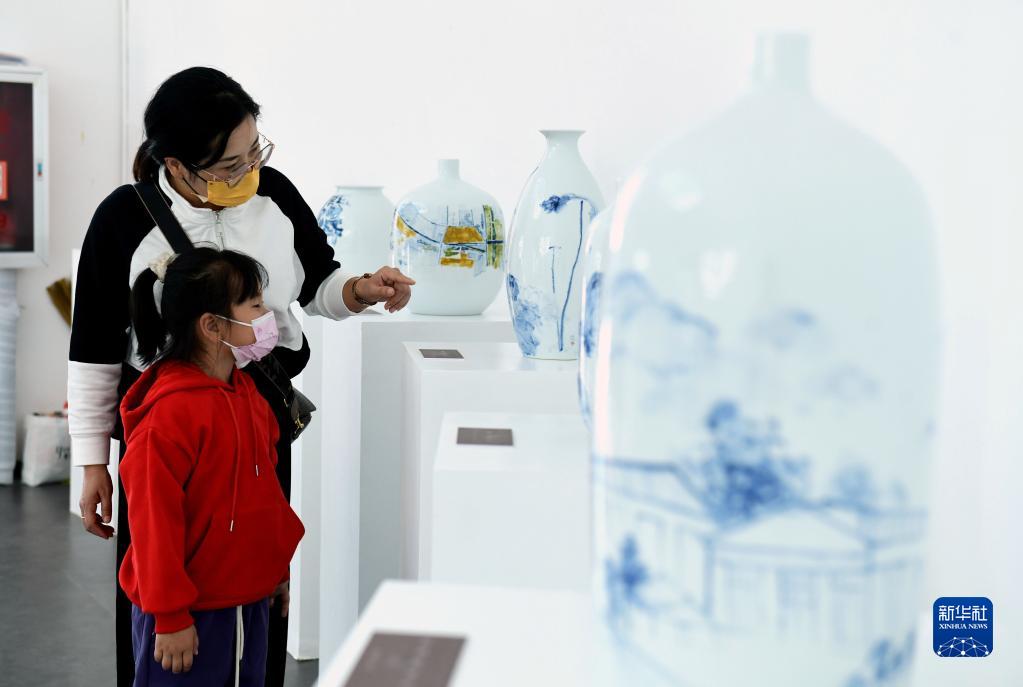 10月4日,游客在河北省石家莊市井陘縣秀林鎮南橫口村陶瓷水鎮展示中心參觀瓷器。