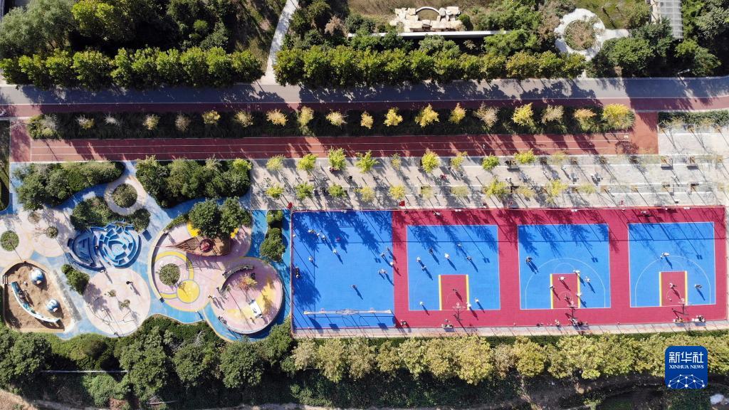 10月4日,市民在河北省石家莊市體育公園休閑(無人機照片)。