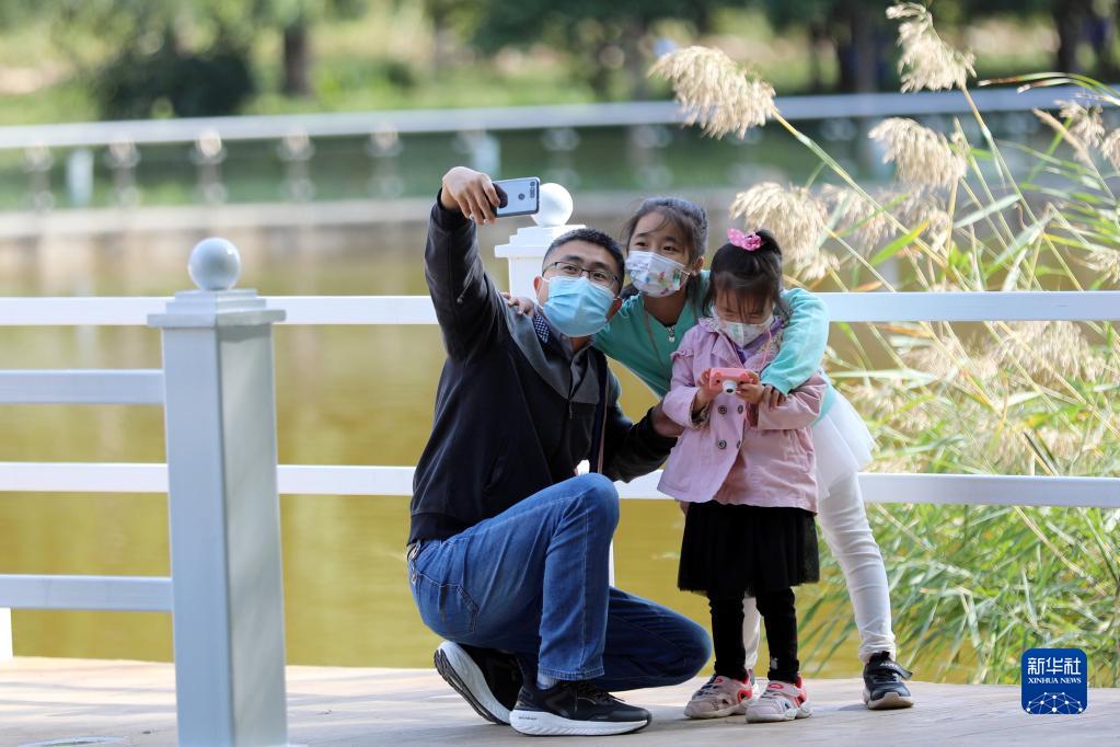 10月4日,市民在河北省石家莊市東環公園游玩拍照。