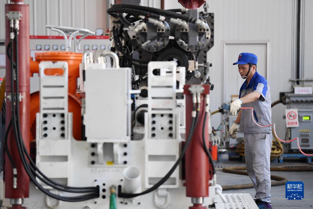 在位于秦創原總窗口所在地陜西省西咸新區的陜西太合智能鉆探有限公司,工人準備對智能定向鉆機進行性能調試(2022年6月17日攝)。新華社記者 李一博 攝