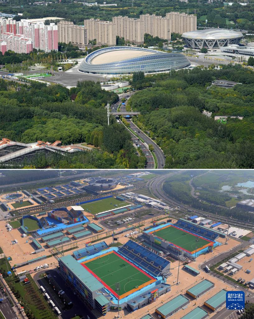 這是一張拼版照片:上圖為2022年9月19日拍攝的2022年北京冬奧會速度滑冰比賽場館國家速滑館。國家速滑館是利用2008年北京奧運會曲棍球和射箭項目的臨時場地建設而成(新華社記者鞠煥宗攝);下圖為2008年8月2日航拍的奧林匹克公園曲棍球場(資料照片,新華社記者陳凱攝)。 新華社發