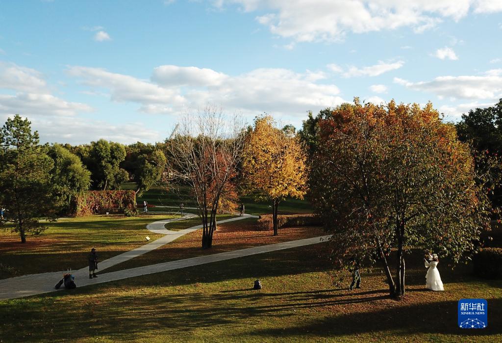 10月4日,游客在太陽島風景區花卉園拍照(無人機照片)。