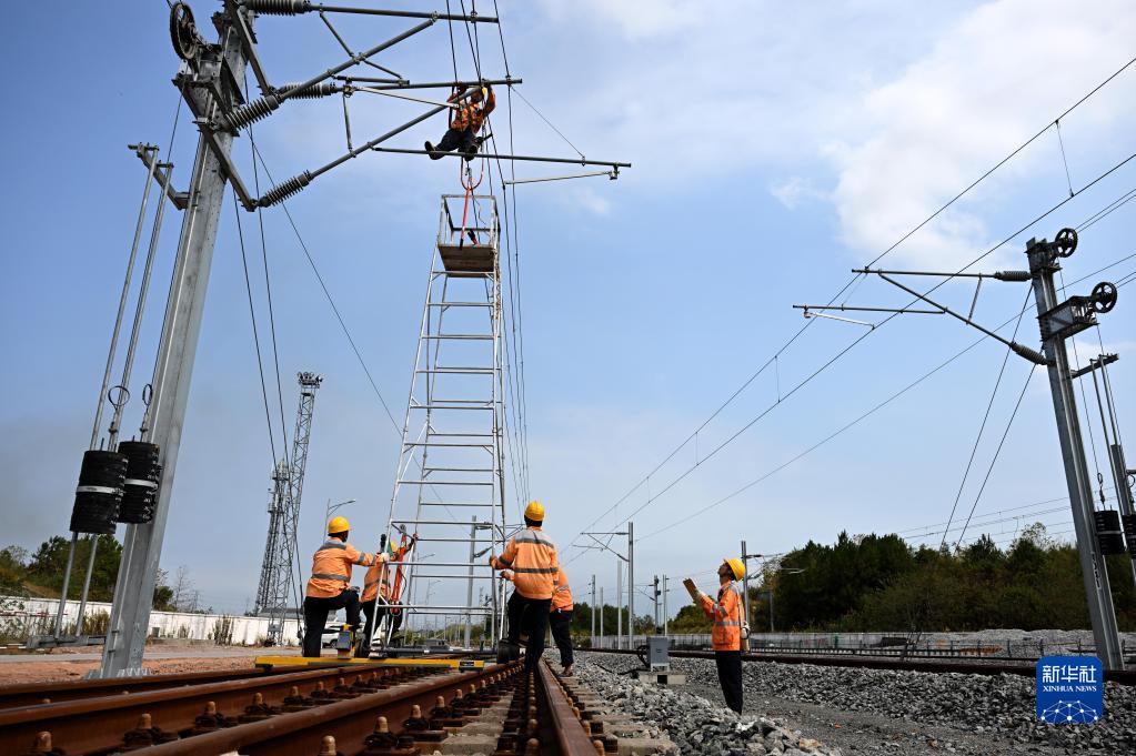 10月4日,在位于安徽黃山的杭昌高速鐵路黃山北存車場,接觸網(wǎng)工在檢修接觸網(wǎng)設備。