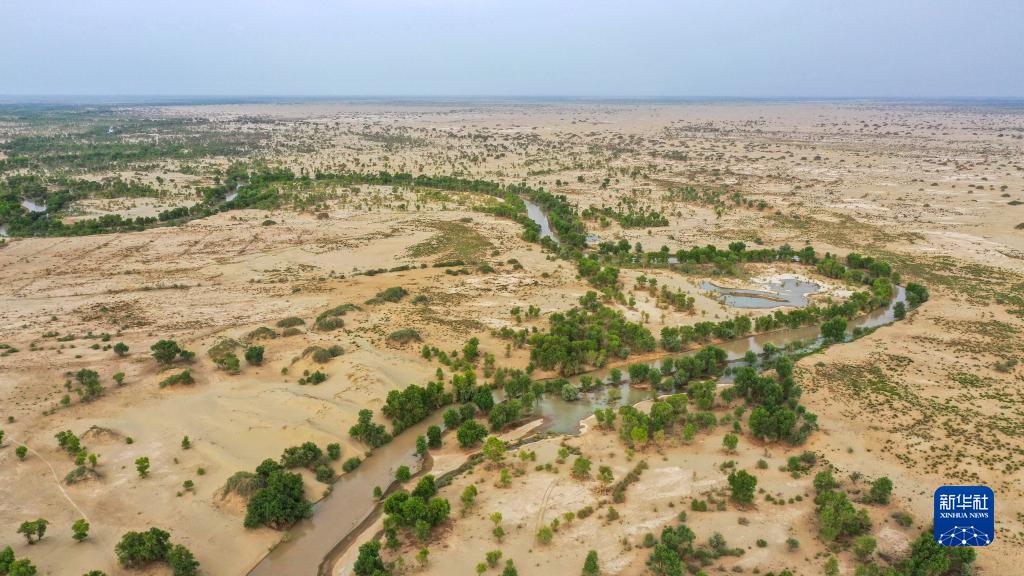 這是2022年6月20日拍攝的新疆尉犁縣墩闊坦鄉(xiāng)托布協(xié)區(qū)域,生態(tài)輸水滋養(yǎng)了植被(無人機照片)。