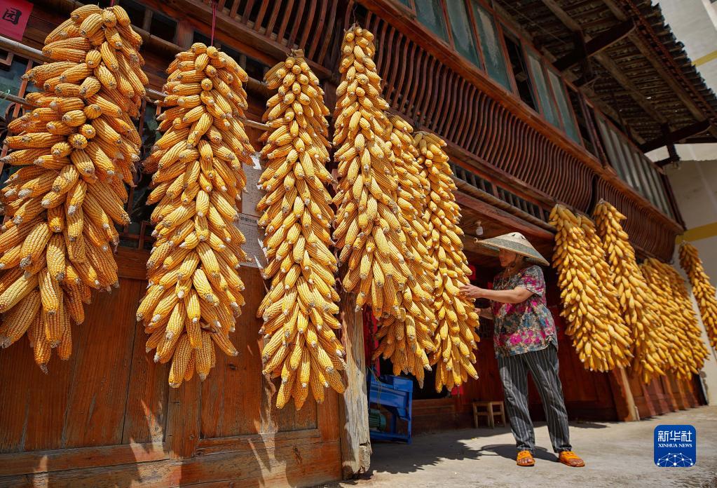 10月5日,貴州省黔東南苗族侗族自治州丹寨縣興仁鎮(zhèn)中營(yíng)村村民在晾曬玉米。