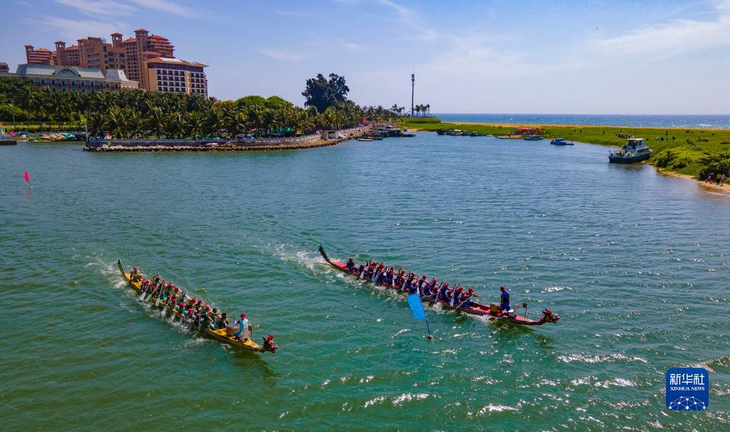 海南省瓊海市博鰲鎮在萬泉河入海口舉行龍舟賽活動(2022年6月3日攝,無人機照片)
