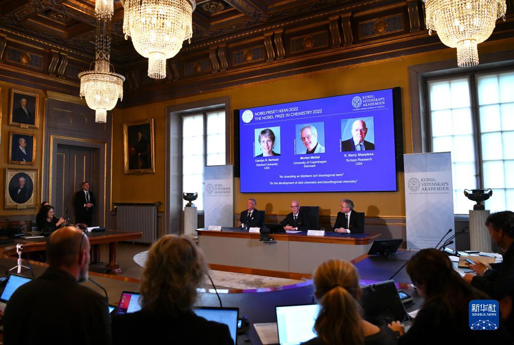 瑞典皇家科學院5日宣布,將2022年諾貝爾化學獎授予美國科學家卡羅琳·貝爾托齊、卡爾·巴里·沙普利斯和丹麥科學家莫滕·梅爾達爾,以表彰他們在發展點擊化學和生物正交化學方面的貢獻。