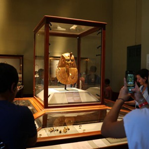 10月5日,在位于埃及開羅的埃及博物館,游客拍攝法老蘇瑟奈斯一世的金面具。