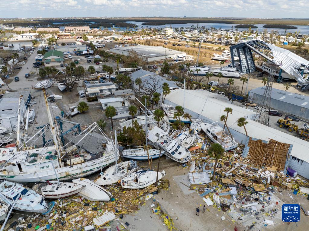 這是10月4日在美國佛羅里達州邁爾斯堡拍攝的遭颶風“伊恩”破壞的船只和建筑。 新華社發(羅蘭多·洛佩斯攝)