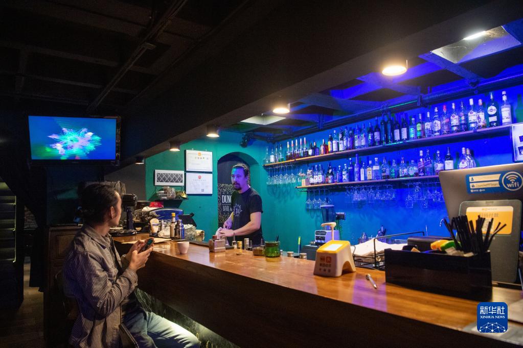 塞爾維亞人邦·斯科特(右)在和中國妻子共同創業的“地窖”酒吧內為客人服務。該酒吧由工業遺址的地下室改造而成(2022年9月23日攝)。