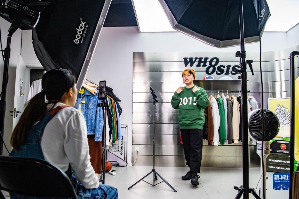在重慶市渝中區(qū)由工業(yè)遺址改造成的“一廠影視園”一家國潮品牌公司內(nèi),創(chuàng)業(yè)者通過手機直播銷售商品(2022年9月27日攝)。