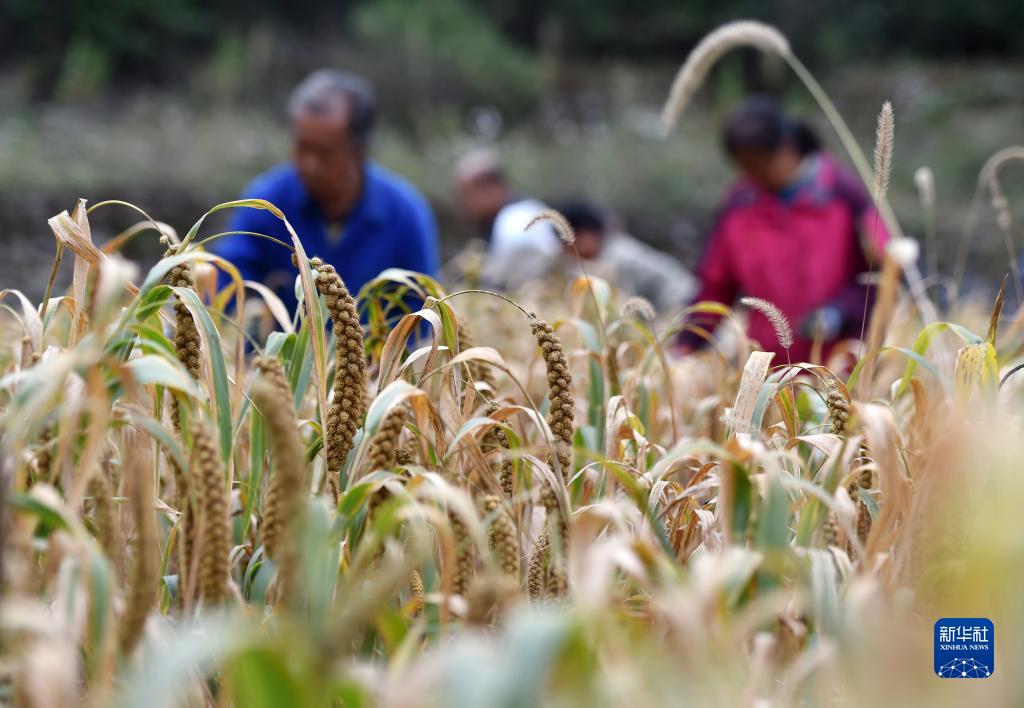 10月6日,河北省石家莊市井陘縣辛莊鄉焦家垴村農民在梯田里搶收谷子。