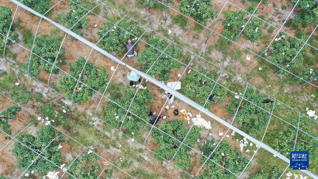 10月6日,貴州省黔東南苗族侗族自治州劍河縣觀么鎮農民在采摘冬桃(無人機照片)。