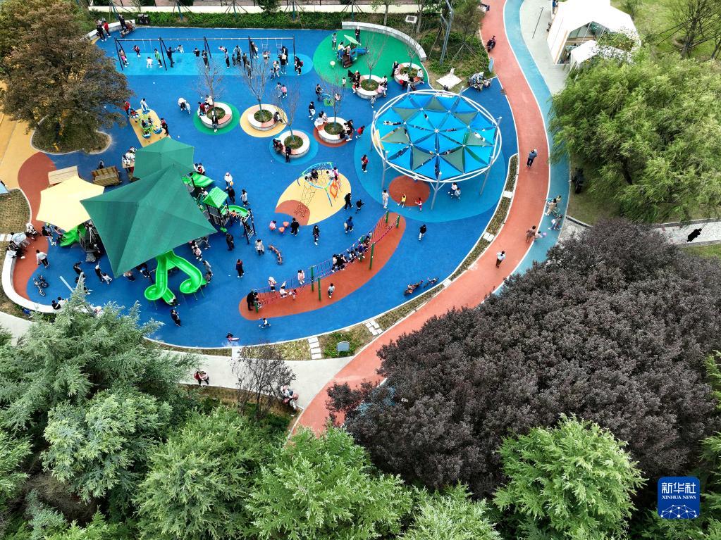 10月6日,青少年在山東青島西海岸新區雙珠公園游樂場玩耍(無人機照片)。