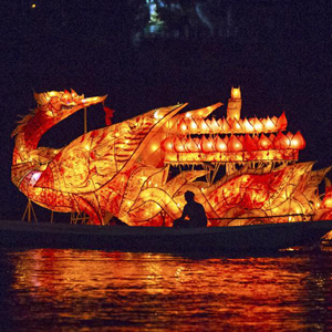 當日,瑯勃拉邦慶祝燈船節。人們用花燈點綴城市,在湄公河上放龍舟燈船,寄托美好的祝福。