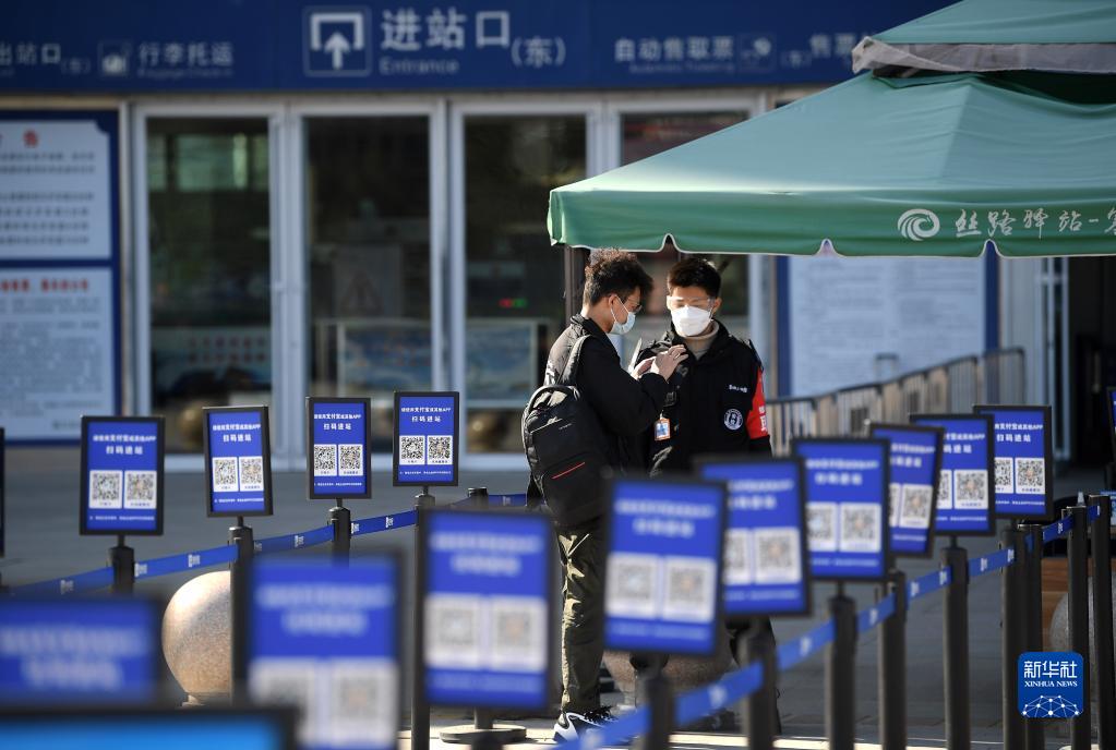 中國鐵路蘭州局集團有限公司銀川車站工作人員(右)在查驗旅客防疫信息(10月11日攝)。