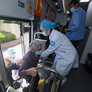 10月13日,移動體檢車上的醫生為丁家港村的村民體檢。