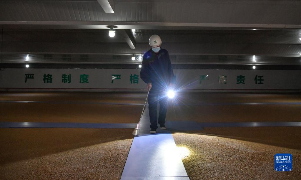 10月12日,在中央儲備糧天津東麗直屬庫有限公司東麗庫區(qū),保管員在倉房內(nèi)巡視檢查。