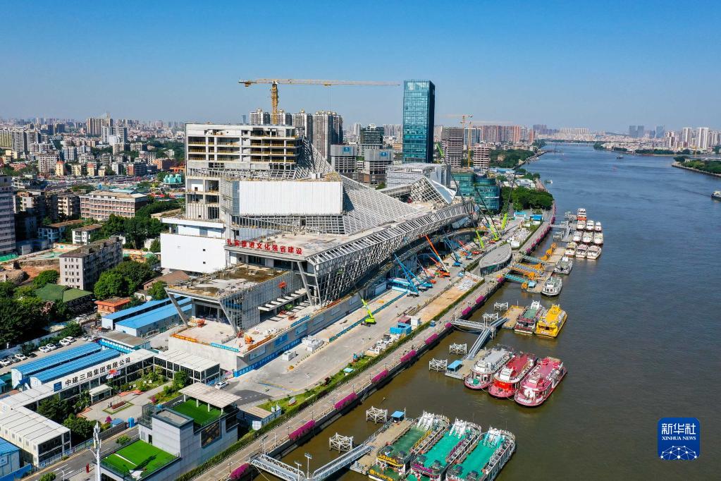 廣東美術(shù)館、廣東非物質(zhì)文化遺產(chǎn)展示中心、廣東文學(xué)館“三館合一”建筑長(zhǎng)350米,高近80米,宛如一艘“文化巨輪”揚(yáng)帆珠江(10月12日攝,無(wú)人機(jī)照片)。