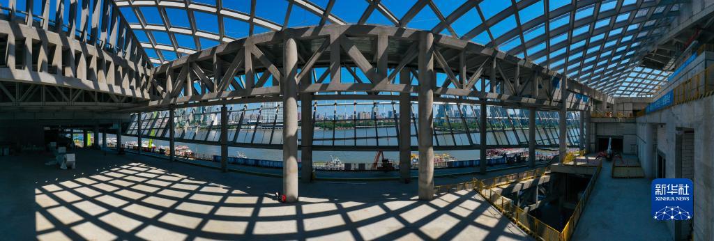 廣東美術館、廣東非物質文化遺產展示中心、廣東文學館“三館合一”的鋼結構連廊形成美妙的光影空間(10月12日攝,無人機全景照片)。