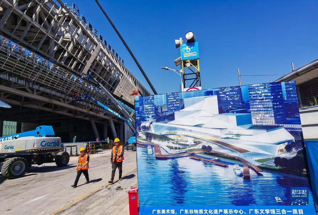 建設(shè)者從廣東美術(shù)館、廣東非物質(zhì)文化遺產(chǎn)展示中心、廣東文學(xué)館“三館合一”項目效果圖旁經(jīng)過(10月12日攝)。