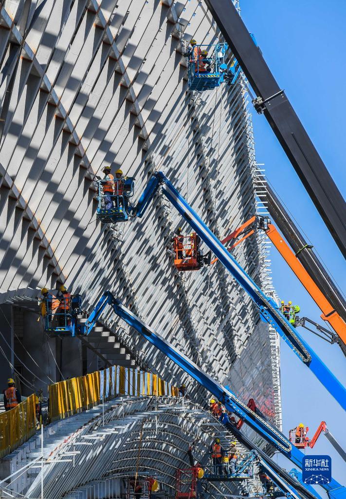 建設者在廣東美術館、廣東非物質文化遺產展示中心、廣東文學館“三館合一”項目進行幕墻施工(10月12日攝)。