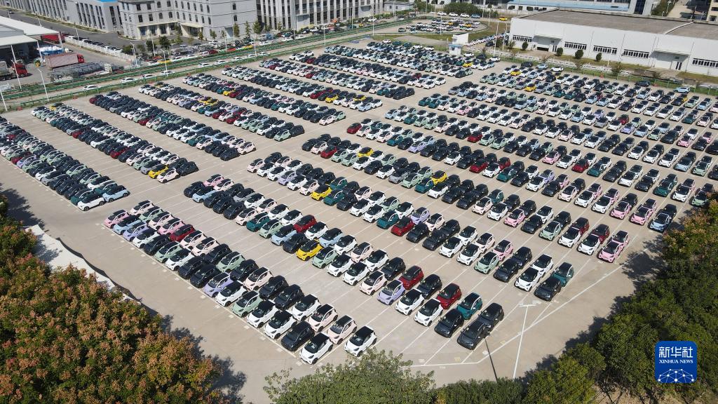10月12日在位于蕪湖市的奇瑞汽車股份有限公司新能源一期工廠拍攝的等待交付的新能源汽車(無人機照片)。