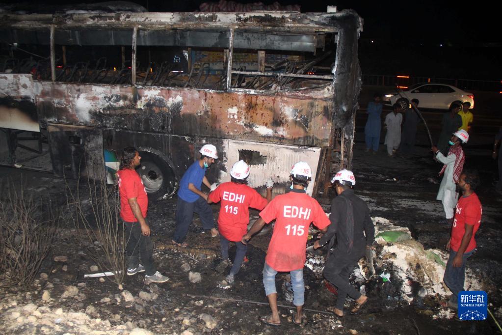 10月13日,救援人員在巴基斯坦信德省賈赫舒洛地區(qū)檢查燒毀的客車。