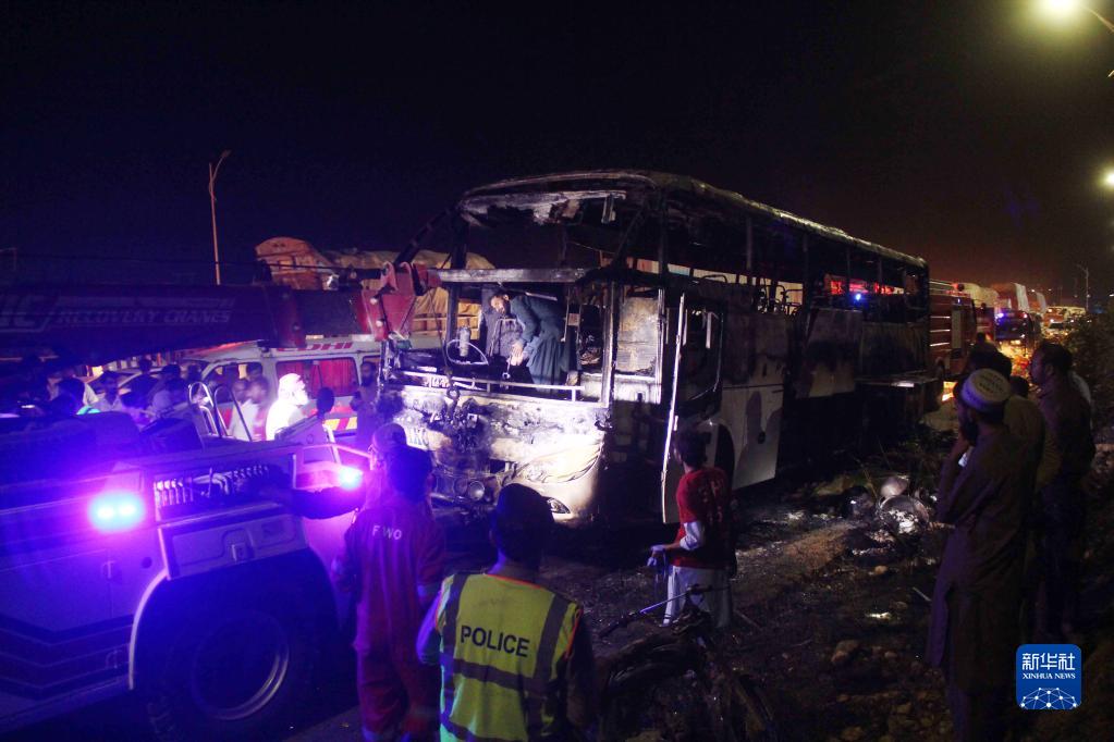 10月13日,救援人員在巴基斯坦信德省賈赫舒洛地區(qū)檢查燒毀的客車。
