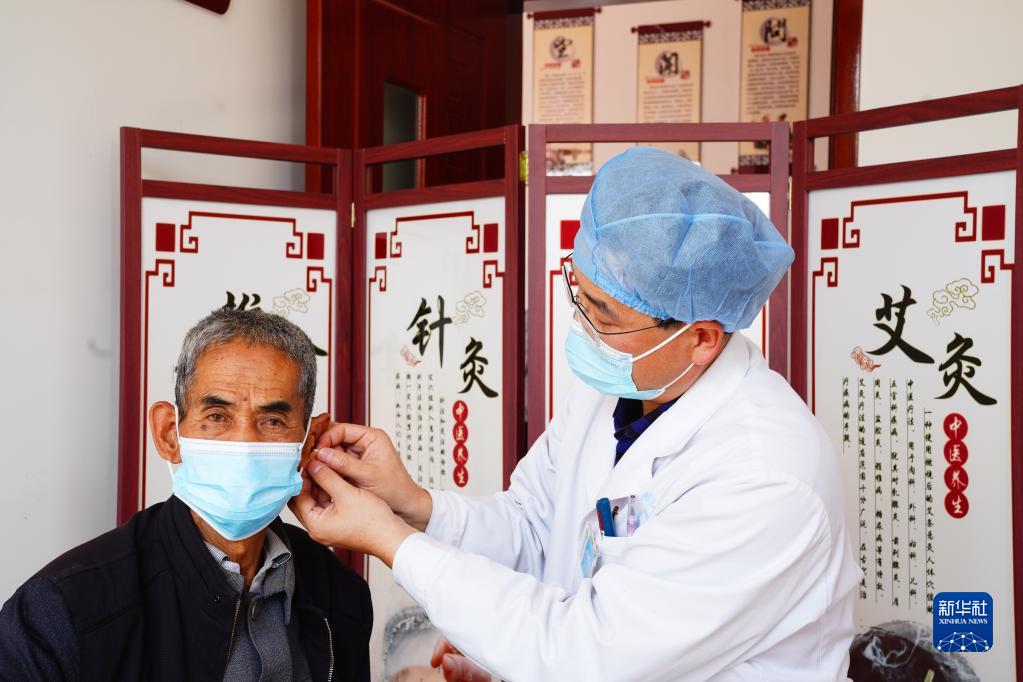 10月13日,在五蓮縣松柏鎮(zhèn)衛(wèi)生院“國(guó)醫(yī)堂”,醫(yī)生在為患者做撳針治療。