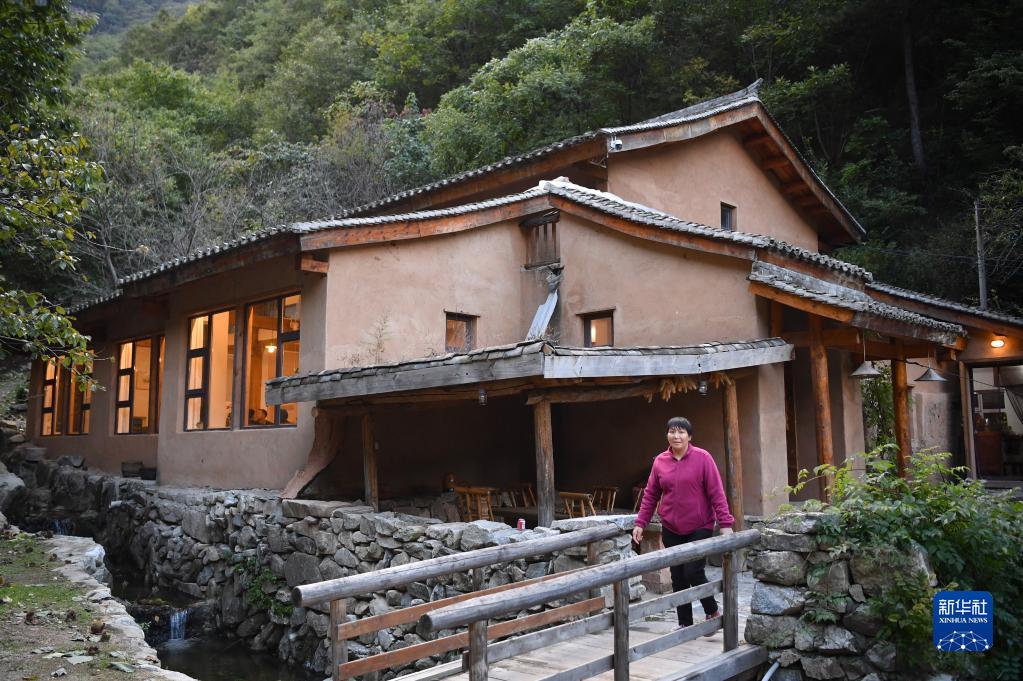 陜西寧陜縣廣貨街鎮(zhèn)沙溝村村民張勝霞在民宿院子里(2022年10月9日攝)。這處民宿由她家的舊房改造而來。