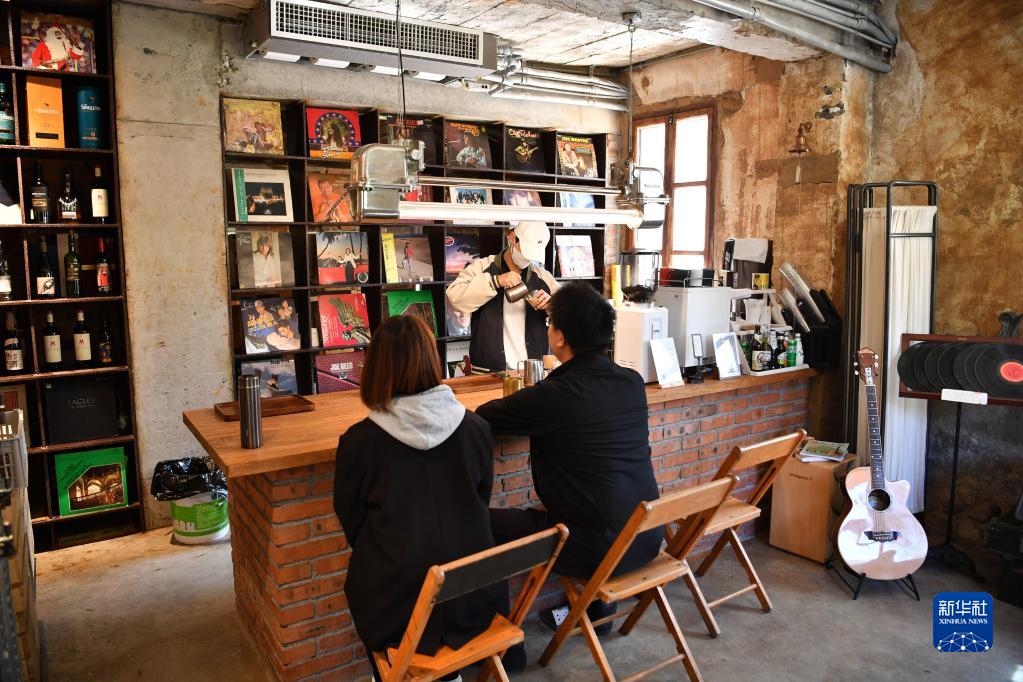 游客在陜西寧陜縣城關(guān)鎮(zhèn)漁灣村的民宿集群社區(qū)中心喝咖啡(2022年10月10日攝)。
