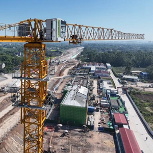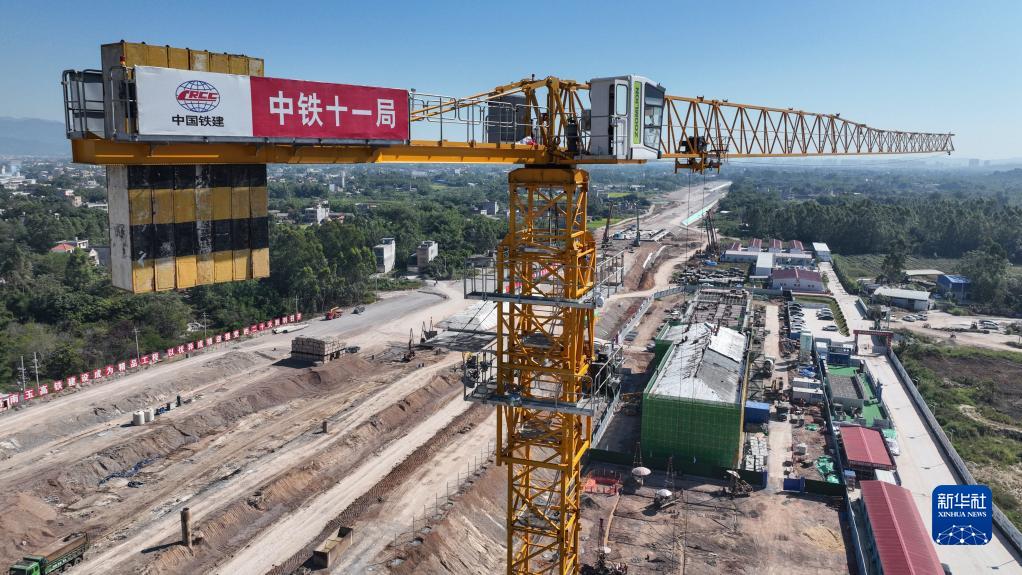 10月13日,在玉林北站站房施工現(xiàn)場,塔吊在吊運材料(無人機照片)。