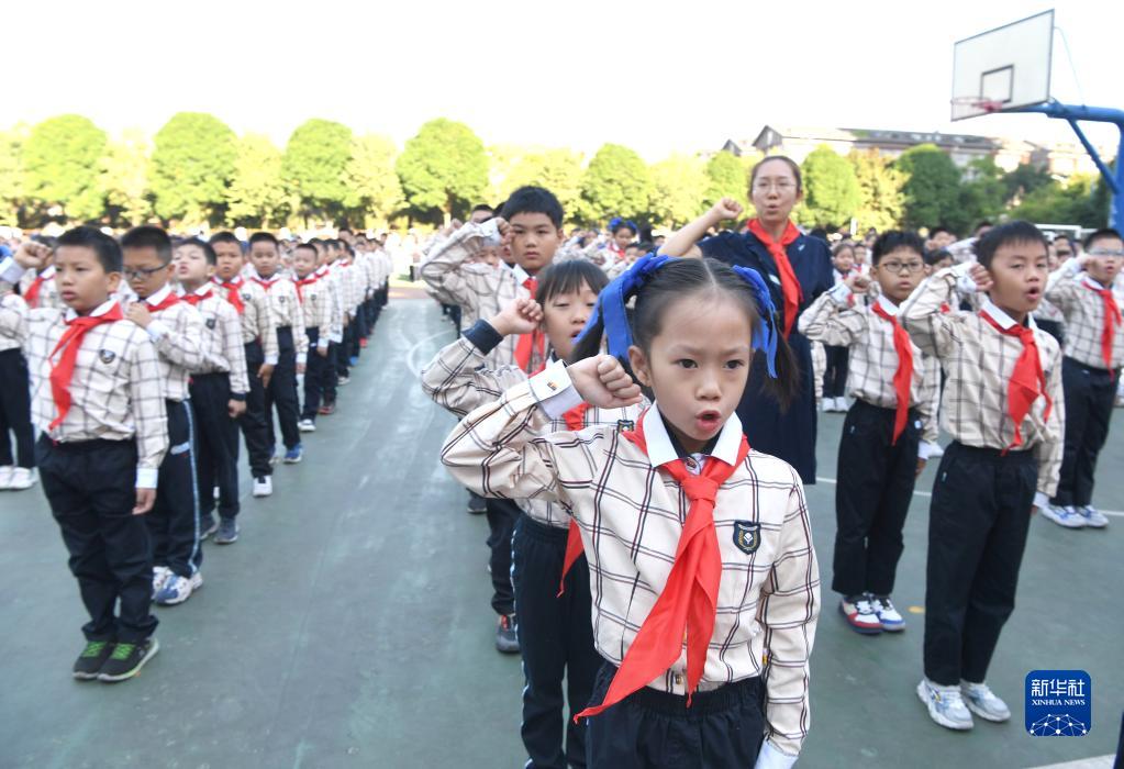 當日是中國少年先鋒隊建隊73周年紀念日,廣西南寧市濱湖路小學舉行新隊員入隊儀式,497名小學生系上紅領巾,光榮加入中國少年先鋒隊。