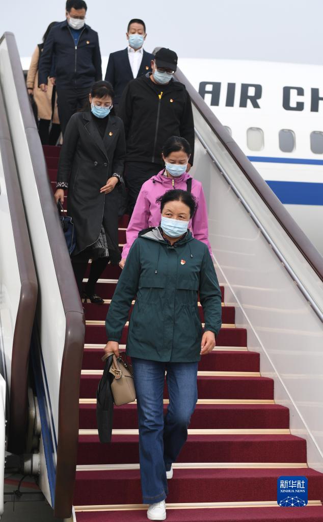 10月13日,來自青海省的黨的二十大代表乘飛機抵達北京首都國際機場。新華社記者 張豪夫 攝